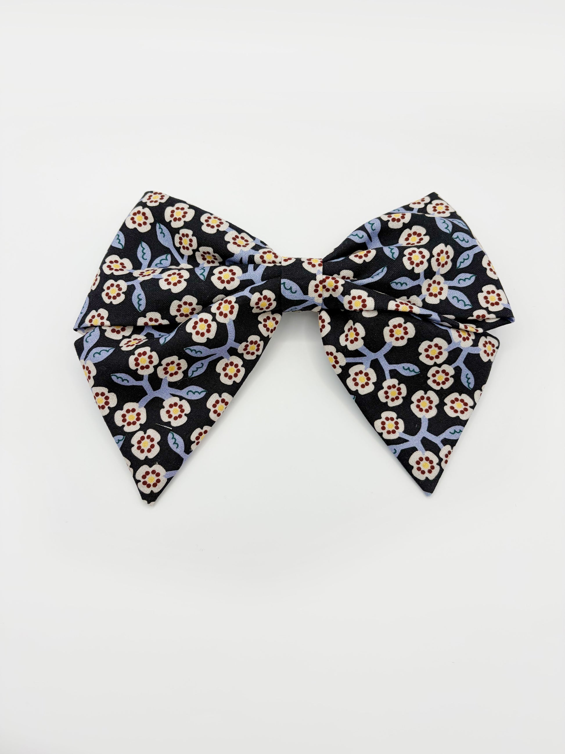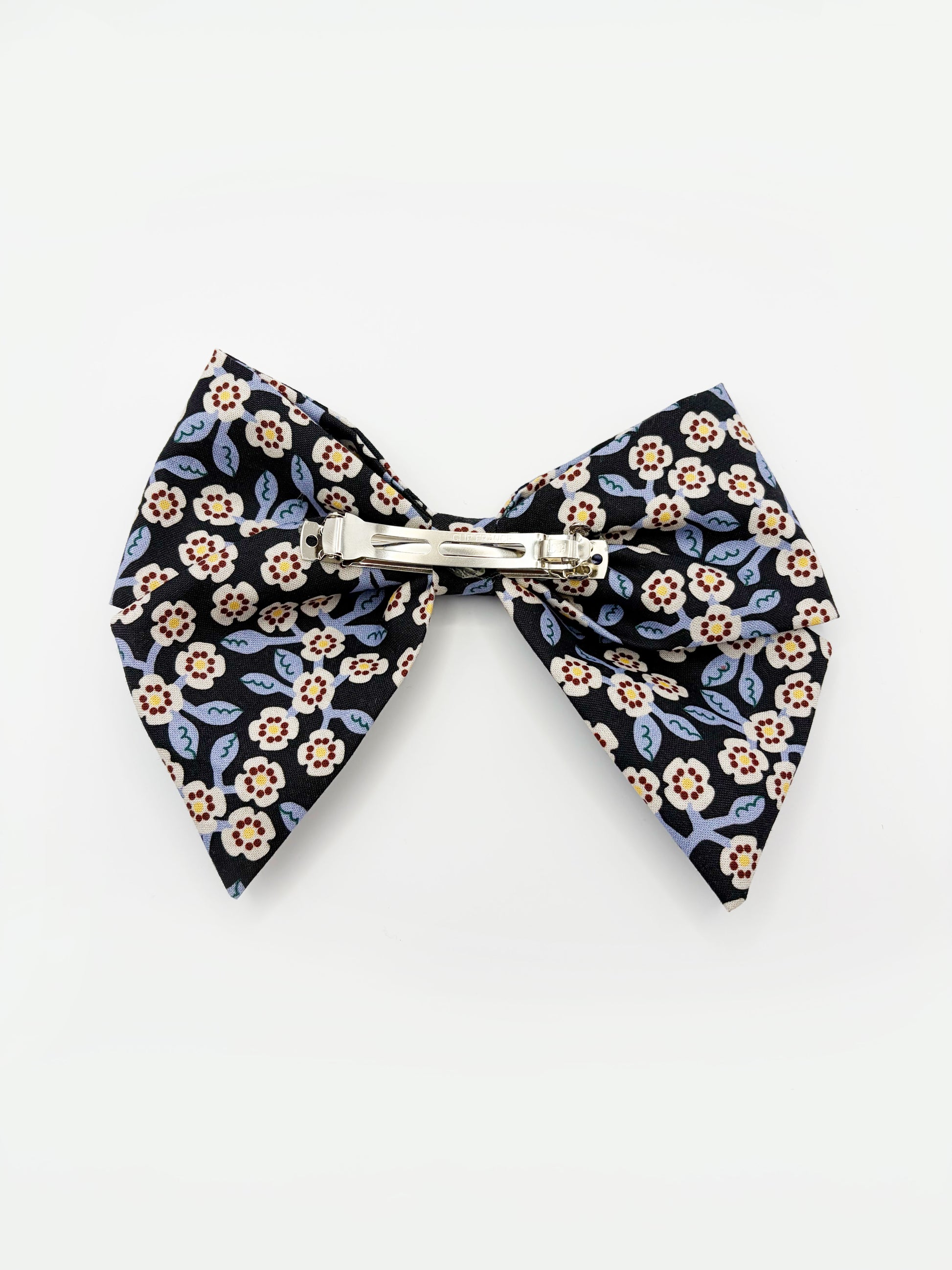 A large handmade hair bow featuring a blue and white briar print set against a black background. The cotton fabric is attached to a sturdy barrette clip.