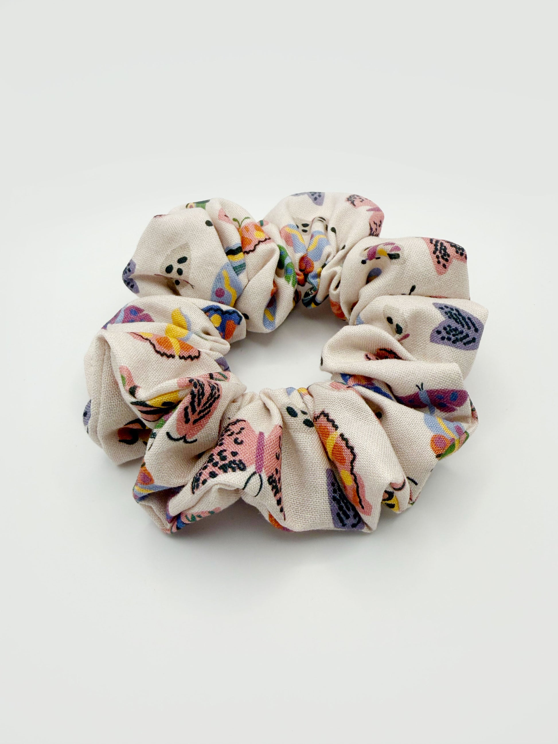 A scrunchie with colorful motifs of butterflies, moths, and other insects, scattered over a neutral background.
